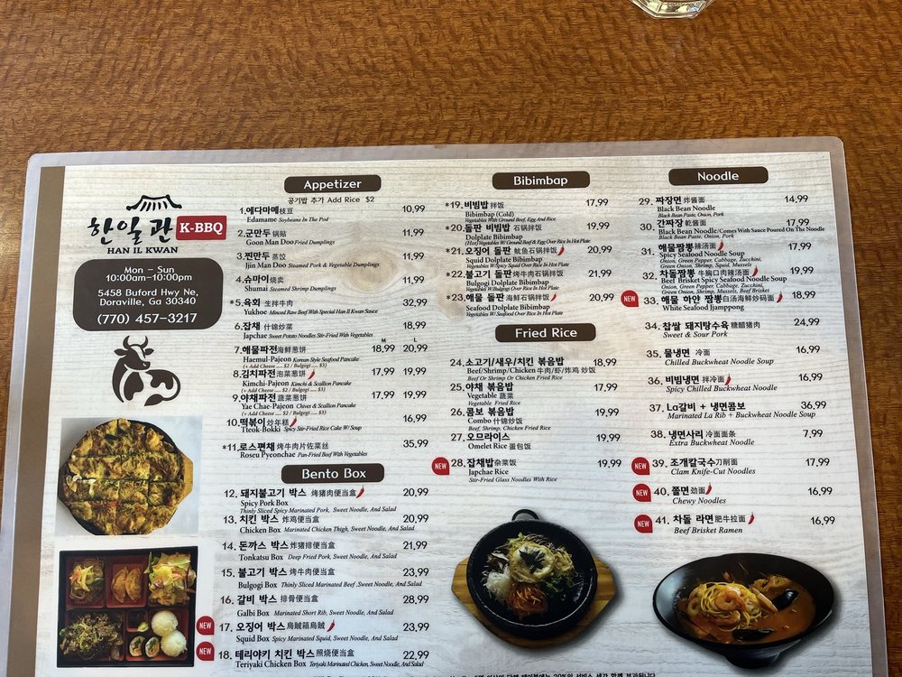 Han Il Kwan, a renowned Korean restaurant located in Doraville, GA, offers a wide range of authentic Korean dishes. From their popular Lunch Box Specials like Spicy Pork and Chicken to savory appetizers like Edamame and Yook Hwe, Han Il Kwan caters to every palate. The Hot Pot options, including Kalguksu Mandu Jeongol and Budae Jeongol, showcase the restaurant's commitment to traditional flavors. Customers rave about the quality and flavors of the food, praising dishes like galbitang and kimchi pancake. With attentive service and a cozy ambiance, Han Il Kwan is a must-visit for Korean food enthusiasts looking for an unforgettable dining experience.